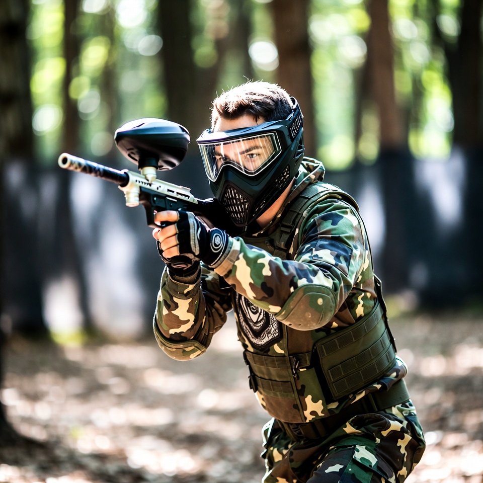 A man in camouflage gear and full face mask crouches in a wooded area, aiming a black paintball gun with both hands. He wears protective goggles, gloves, and a tactical vest amid green trees and blurred netting barriers. Sunlight filters through the dense forest background.
