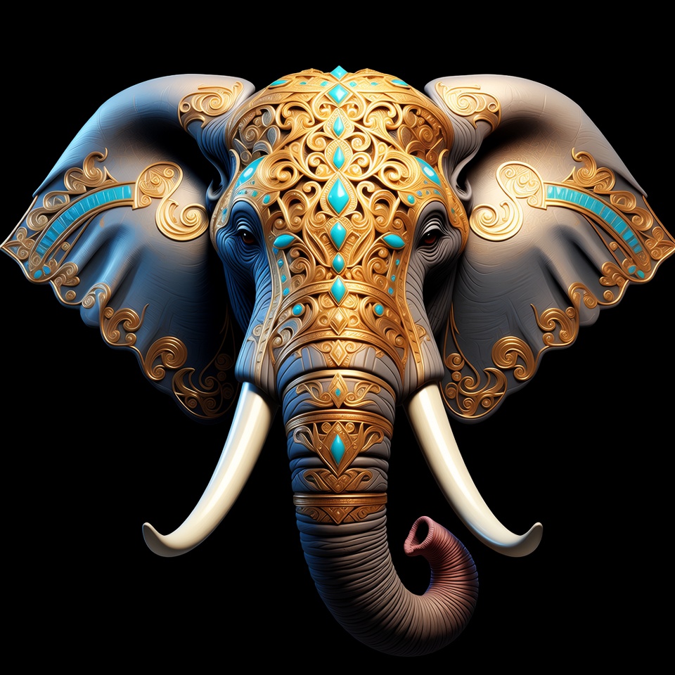 A detailed 3D illustration of an elephant head features intricate gold and turquoise filigree patterns on its ears, forehead, and trunk. The elephant has large curved tusks, expressive eyes, and a curled trunk. It is presented against a solid black background.