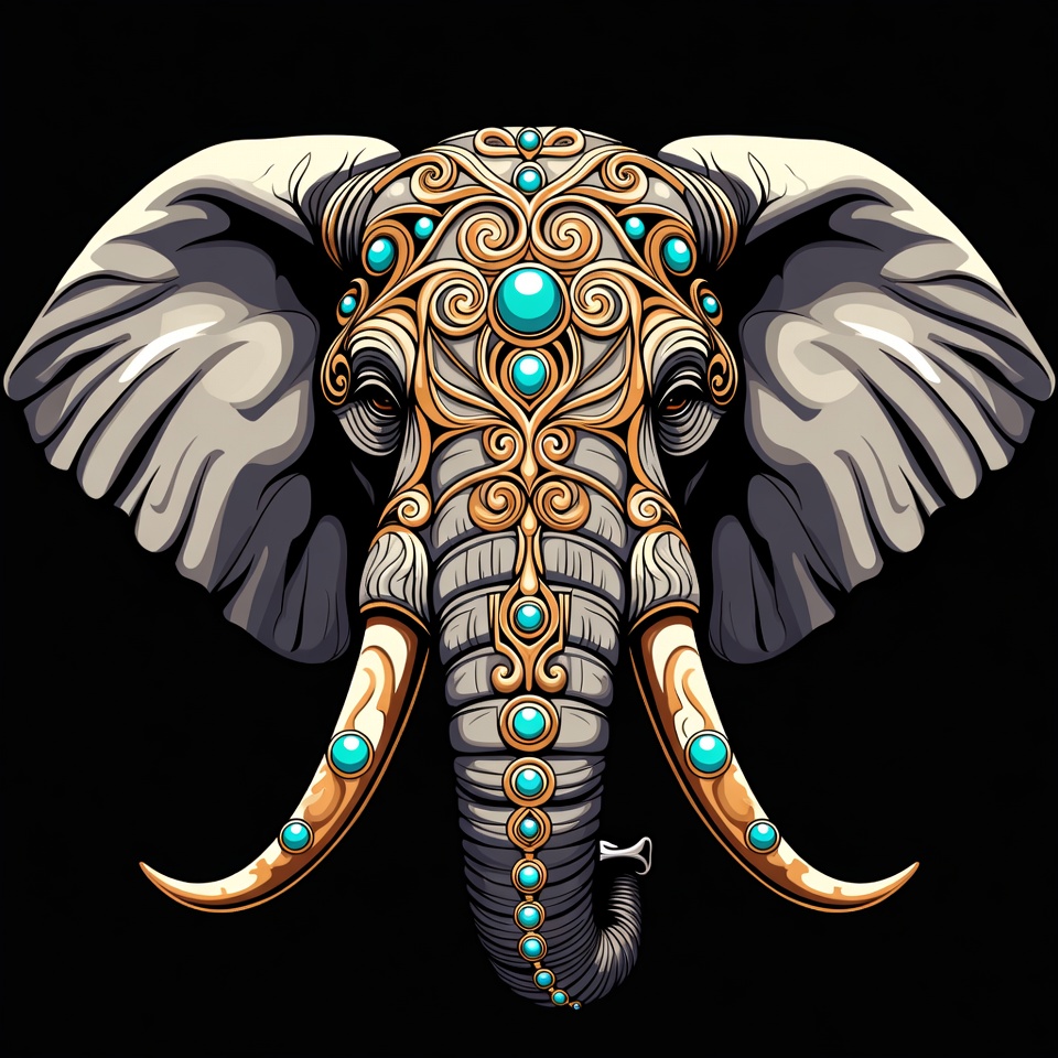 animal illustration, artistic elephant, black background, decorative art, detailed drawing, digital art, elephant head, fantasy animal, gold filigree, isolated background, jeweled elephant, luxury elephant, majestic elephant, mandala elephant, ornate elephant, tribal design, turquoise gems, vector illustration, wildlife art, elephant