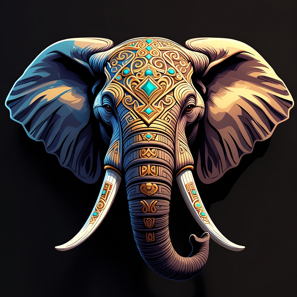 animal illustration, artistic elephant, decorative animal, detailed illustration, digital art, elephant head, fantasy elephant, gold patterns, golden elephant, isolated background, large ears, long tusks, majestic elephant, ornate elephant, tribal patterns, trunk, turquoise gems, vector art, wildlife art, elephant