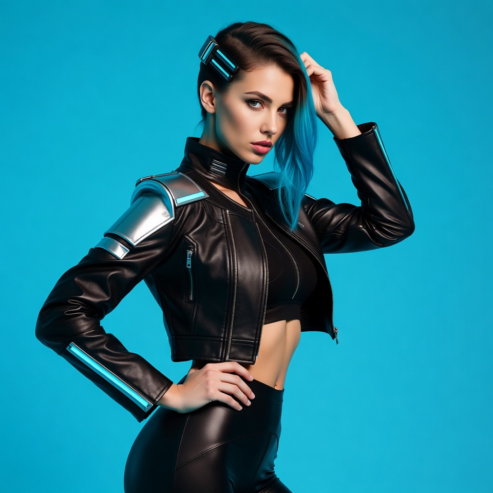 A young woman with blue hair streaks and cyberpunk hair clips poses confidently against a bright blue background. She wears a black leather jacket with metallic shoulder pads and guards, paired with tight black leather pants. Her hand touches her hair while the other rests on her hip.