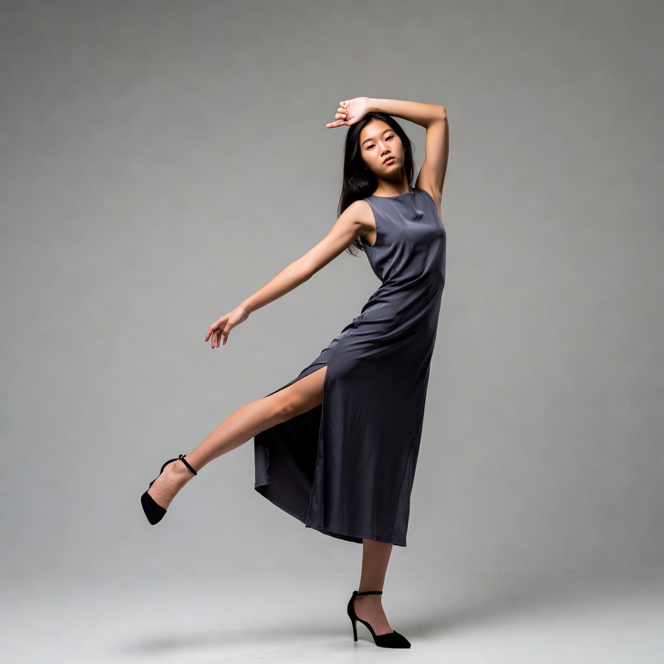Asian, arm raised, black heels, dance pose, dancing, dark hair, dynamic pose, elegant pose, fashion pose, female dancer, graceful dancer, gray dress, high heels, leg lifted, long hair, sleeveless dress, slit dress, studio background, young woman, woman