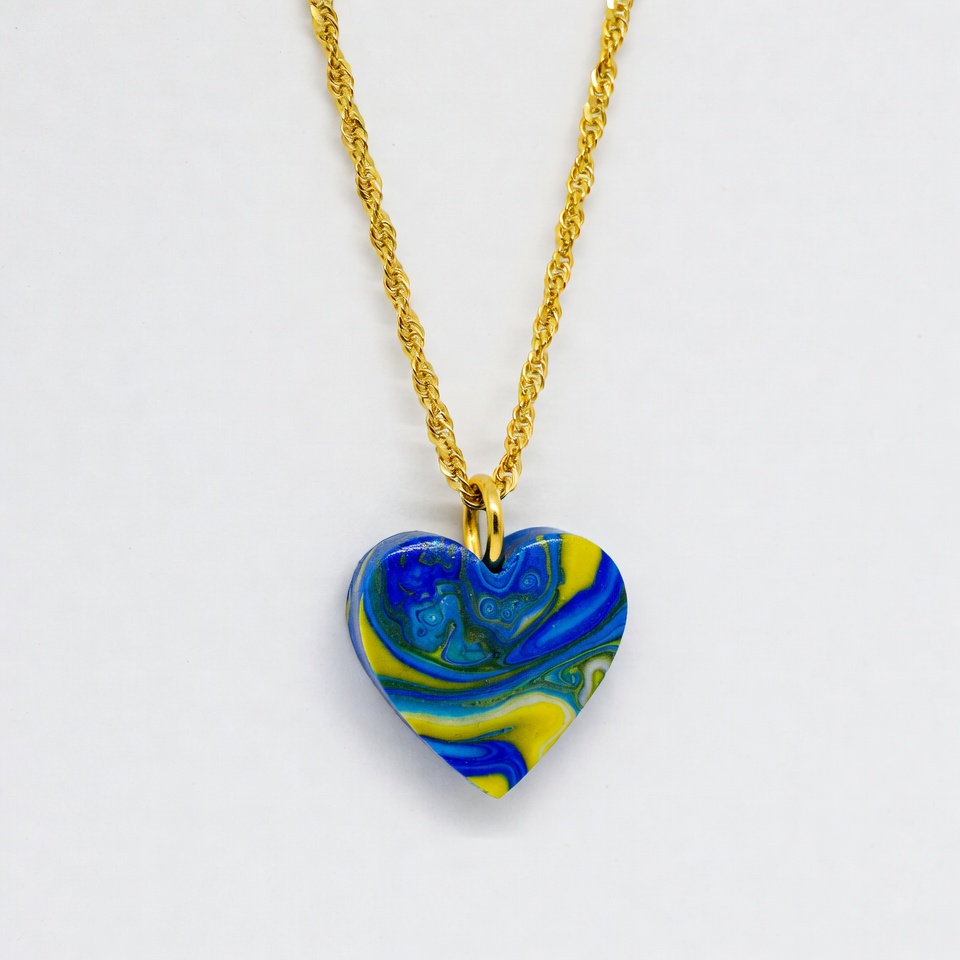 blue heart, blue yellow swirl, colorful heart, fashion accessory, glossy pendant, gold chain, heart pendant, isolated background, jewelry, marble pattern, pendant, resin jewelry, swirled design, yellow heart, necklace