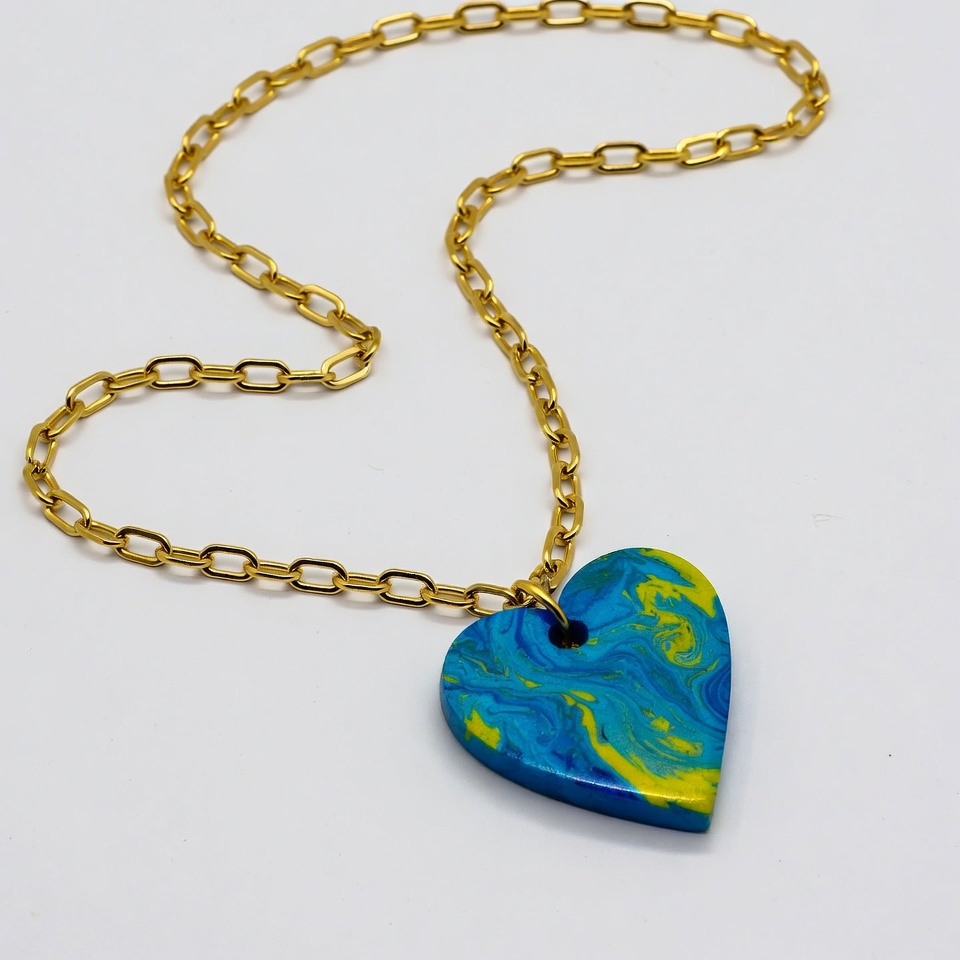 A gold chain necklace features a large heart-shaped pendant with a marbled blue and yellow pattern. The pendant has a textured, swirling design and hangs from the curved chain against an isolated white background. The jewelry is displayed close-up, highlighting its glossy finish and vibrant colors.