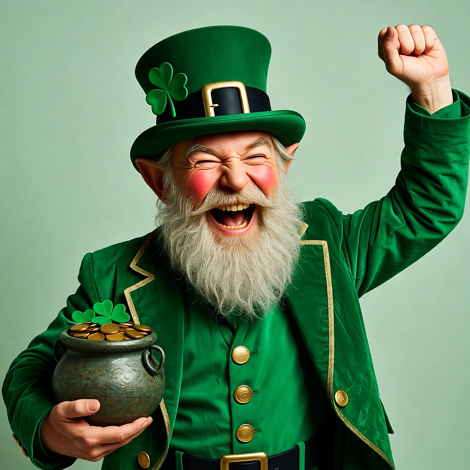 A cheerful leprechaun with a large white beard and green top hat adorned with shamrocks holds a pot of gold coins in one hand while raising the other fist in excitement. He wears a green suit with gold trim and buttons, standing against a light green background. His face shows a wide smile with rosy cheeks and squinted eyes.