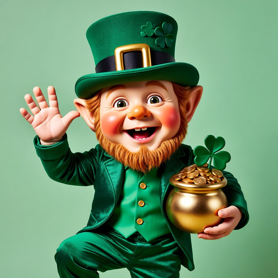 Waving Leprechaun with Gold Pot