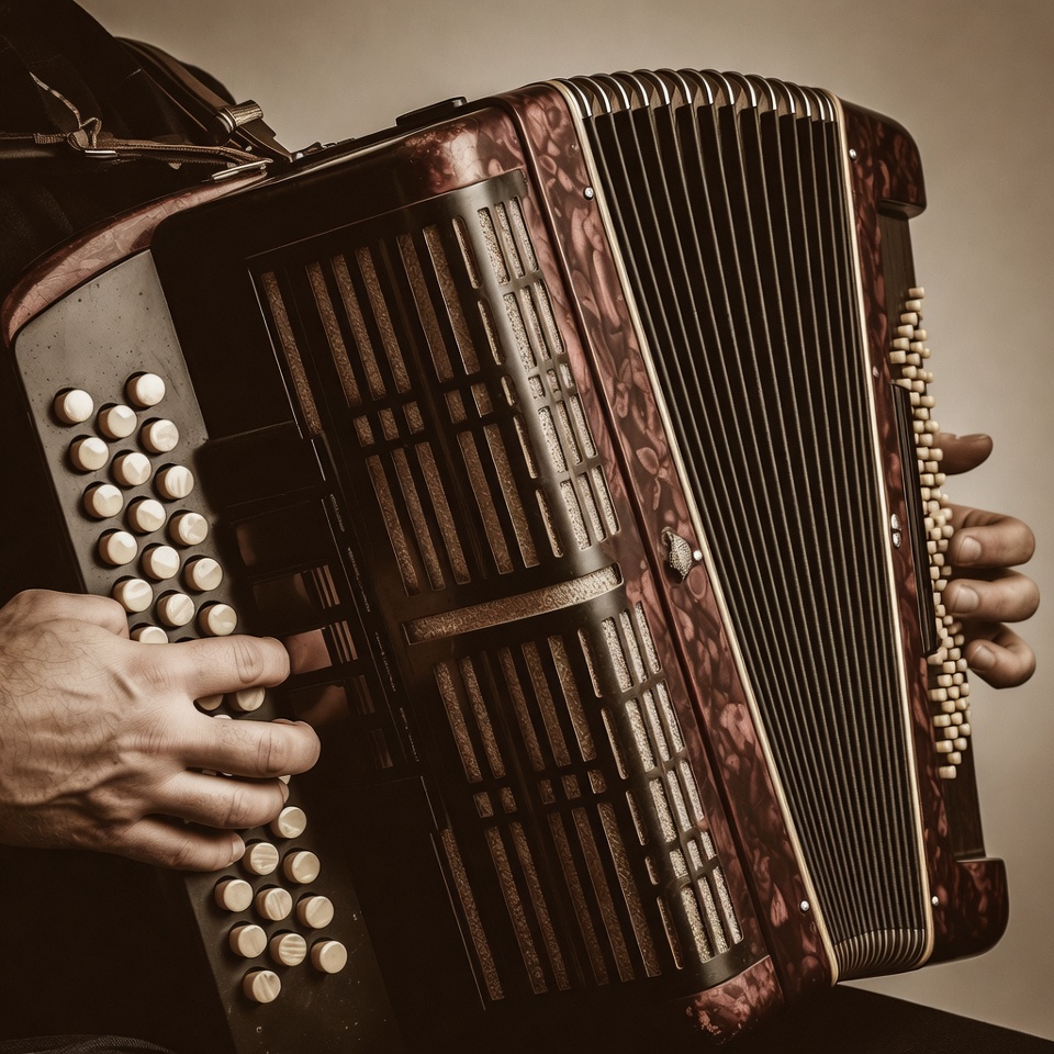 A man's hands play a large red accordion with black bellows and white buttons. The instrument is held against a neutral background. The vintage-toned photo highlights the detailed keys and straps.