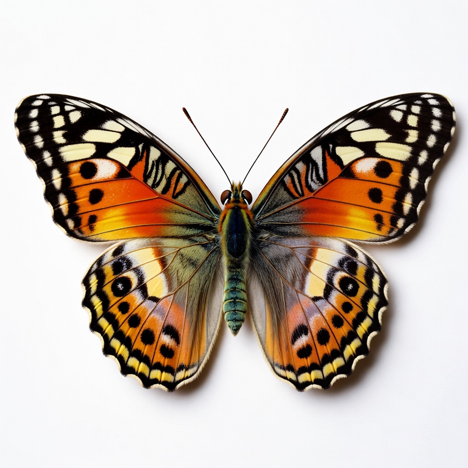 A vibrant buckeye butterfly with orange, black, and white wings is displayed with wings fully spread. It features distinctive eyespots on the wings and a green body. The butterfly is isolated against a plain white background.
