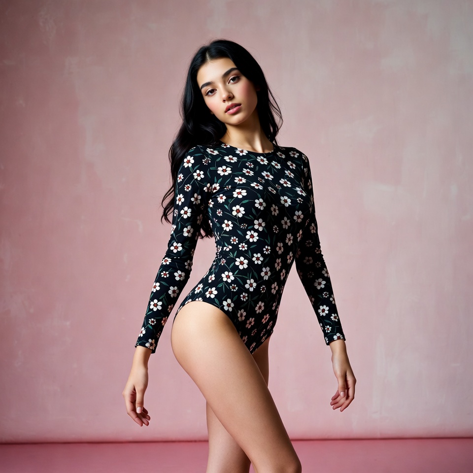 A young woman with long dark hair stands in a side pose wearing a black long-sleeve bodysuit covered in white floral patterns. She has a slim figure with visible curves and is positioned against a pink textured background. Her expression is neutral with hands relaxed at her sides.