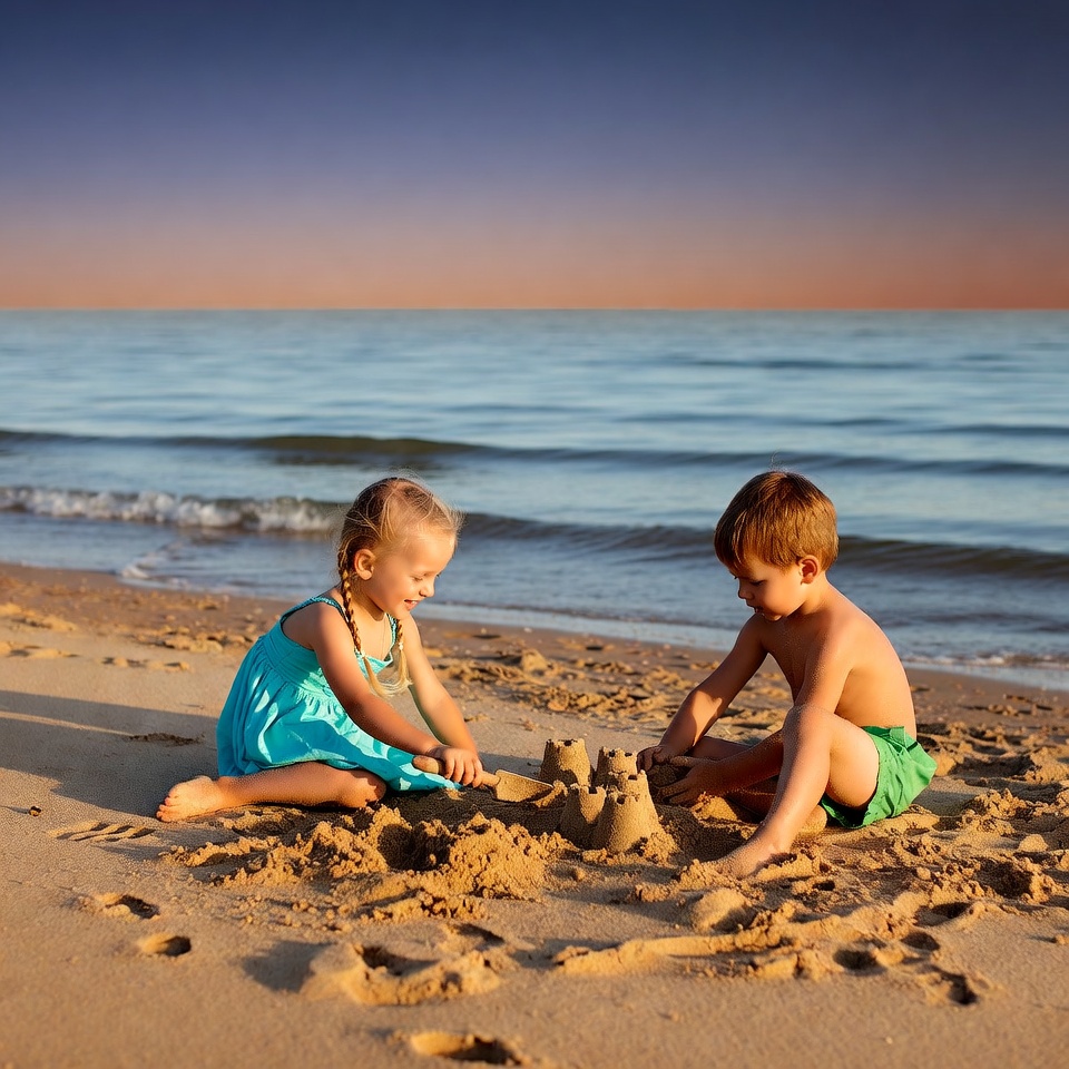 White, barefoot, beach, blue dress, building, children, dress, girl, green trunks, hands, kids, ocean, playing, sand, sandcastle, seashore, shore, siblings, sitting, sky, summer, sunset, swimsuit, vacation, water, waves, young, boy