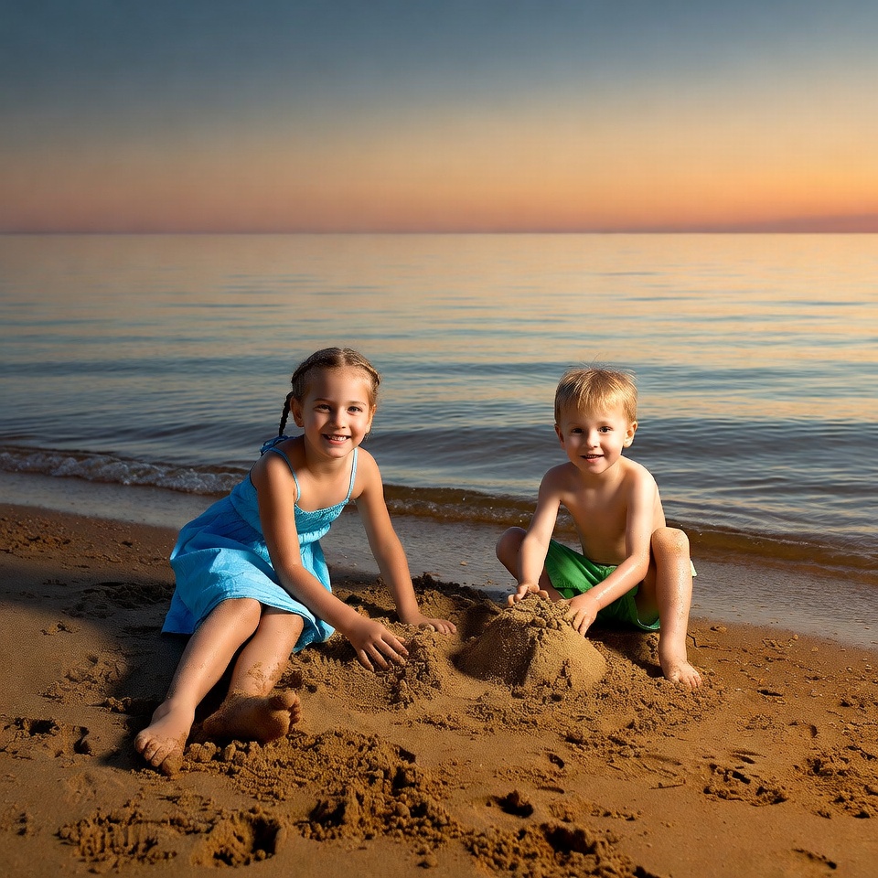 A young boy and girl sit on a sandy beach at sunset, building a sandcastle together. The girl wears a blue dress and the boy wears green swim trunks, both playing with wet sand near the water's edge. The sky features a beautiful gradient of blue and orange hues over the calm sea.