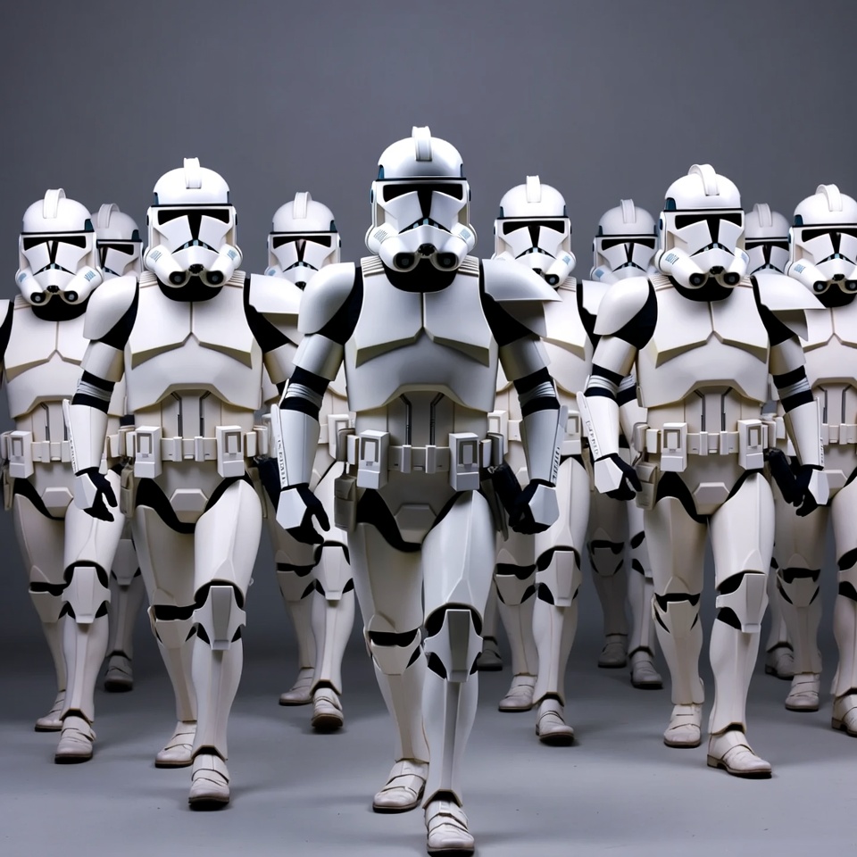 A large group of white-armored Stormtroopers from Star Wars stands in formation on a gray background. They wear iconic helmets with black visors and hold blaster rifles at their sides. The troopers are arranged in rows, facing forward in a disciplined military pose.
