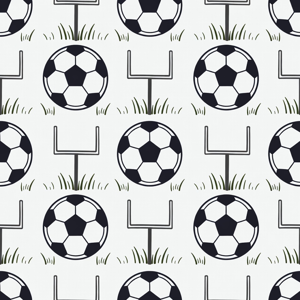 black white, clipart, football pattern, goal posts, grass, illustration, isolated background, line art, repeating pattern, seamless pattern, soccer equipment, soccer field, soccer goals, sports pattern, vector pattern, soccer balls