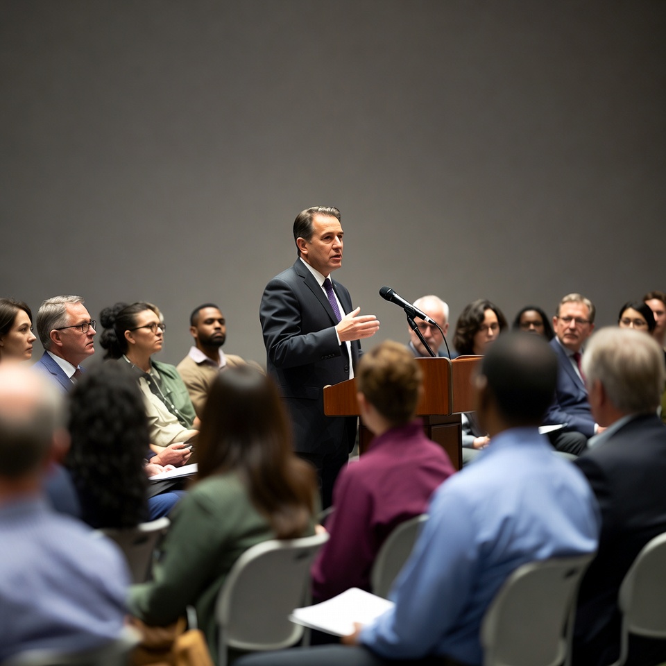 A man in a dark suit stands at a wooden podium speaking into a microphone. A diverse audience of men and women seated in chairs listens attentively in a large conference room. The audience includes various ethnicities and ages, with some holding notebooks.
