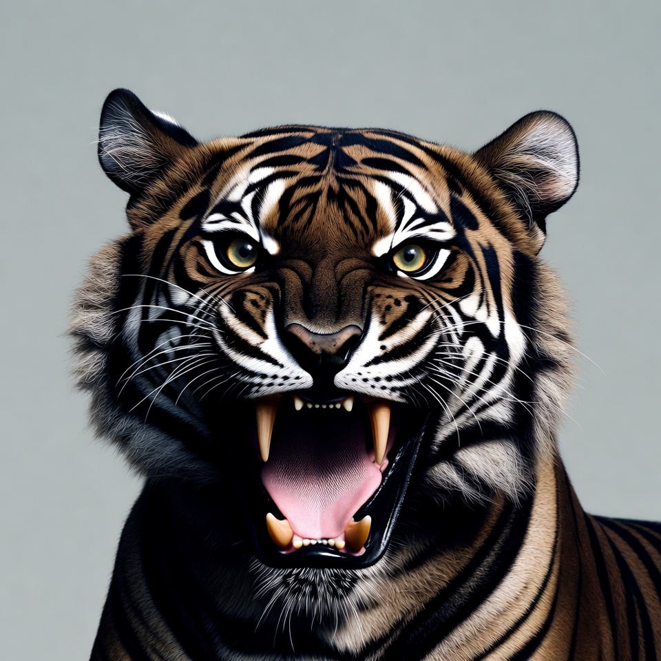 A fierce tiger with orange fur and black stripes faces forward against a plain gray background. It roars aggressively with its mouth wide open, revealing sharp white fangs and a pink tongue. Its green eyes glare intensely, and its large ears are perked up.