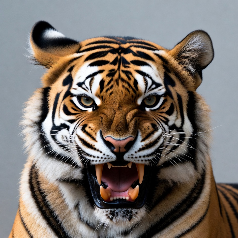 A close-up of a tiger's face shows its fierce expression with mouth wide open, revealing sharp fangs. The tiger has striking orange fur with black stripes and intense green eyes. It is positioned against a plain gray background.