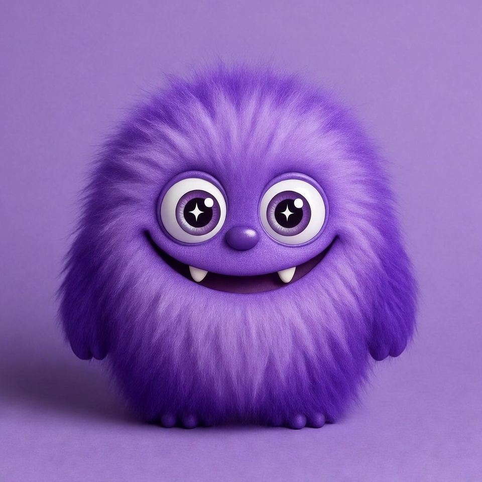 3D render, adorable, big eyes, cartoon monster, cute monster, fangs, fantasy creature, fluffy creature, furry monster, googly eyes, illustration, isolated background, kawaii, plush toy, purple fur, smiling monster, starry eyes, vibrant purple, whimsical, purple monster