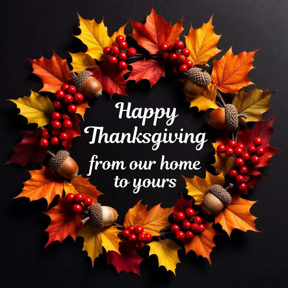 A circular wreath made of vibrant orange and red autumn leaves, red berries, and brown acorns is arranged on a black background. White text in the center reads 'Happy Thanksgiving from our home to yours'. The fall decorations form a festive holiday greeting.