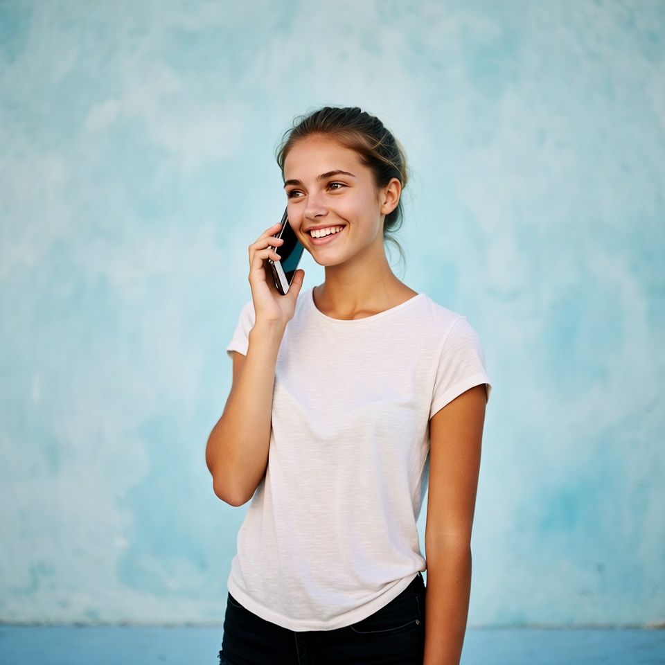 A young woman with blonde hair in a ponytail smiles happily while talking on her smartphone. She wears a white short-sleeved t-shirt and black shorts, standing against a solid blue background. Her expression is joyful with bright eyes and an open-mouthed smile.