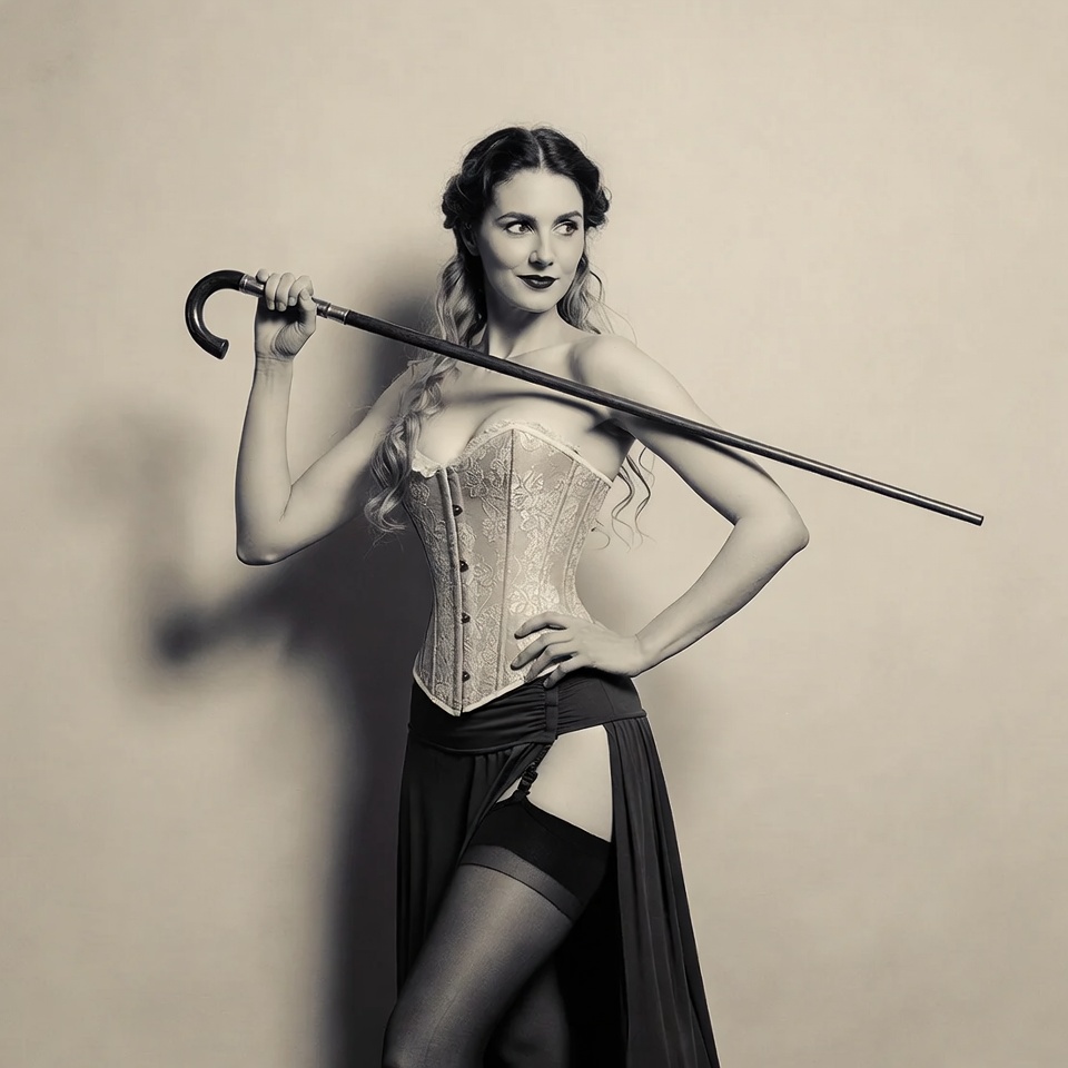 Woman in corset holding cane