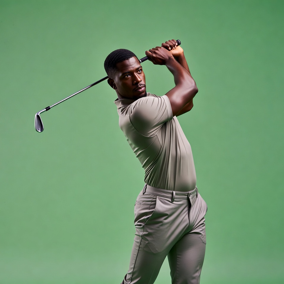 African-American, action pose, athletic man, black man, driver club, golf driver, golf pose, golf swing, golfer, golfing, gray shirt, green background, isolated background, male, man, muscular arms, pants, polo shirt, short hair, sports, sportswear, swinging club, young man, golf