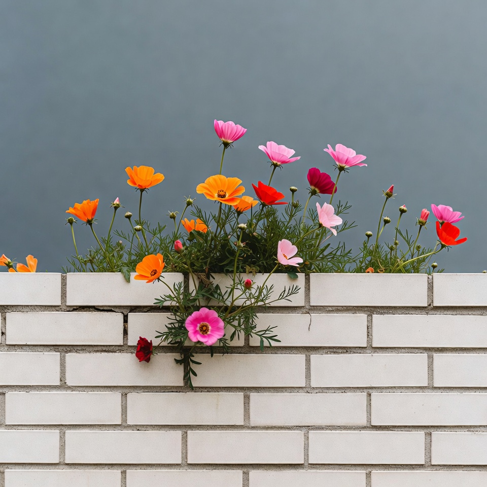 A cluster of vibrant flowers in shades of orange, pink, red, and purple grows through cracks in a white brick wall. The flowers feature delicate petals and green stems against a gray background. The arrangement appears natural and isolated.