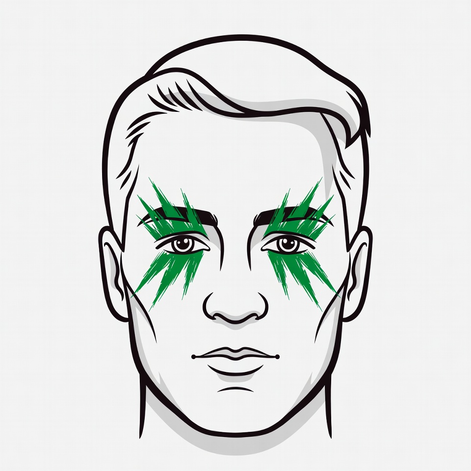 artistic makeup, bold makeup, cartoon face, dramatic lashes, eyelash makeup, face paint, green eyelashes, green makeup, illustration, isolated background, line art, male, portrait, short hair, spiky lashes, vector art, man