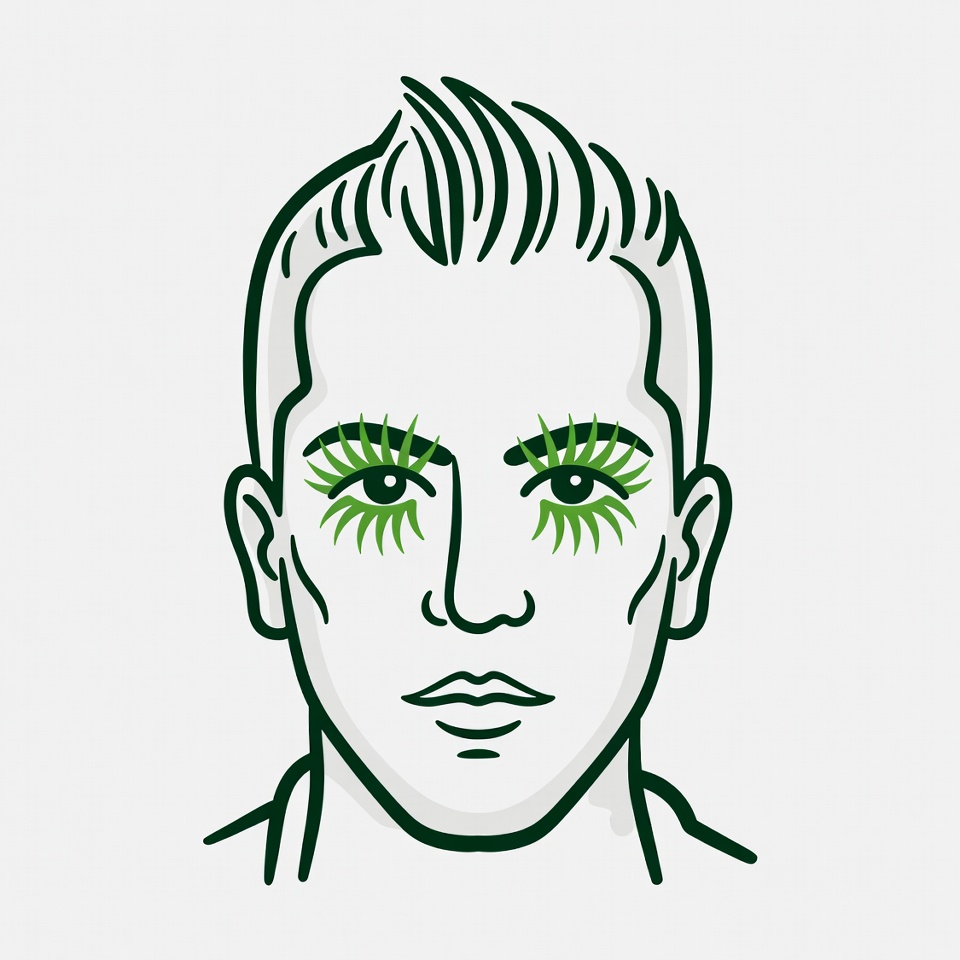 A line-drawn illustration of a man's face features prominent green eyelashes on both eyes. He has short spiked hair and a neutral expression on a plain white background. The artwork uses bold green outlines for the eyelashes contrasting with black line art.