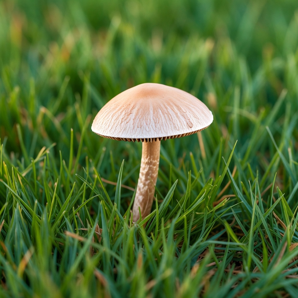 A single beige mushroom with a convex cap and slender stem grows in lush green grass. The cap features white gills underneath and is slightly textured. The background is blurred, emphasizing the mushroom.