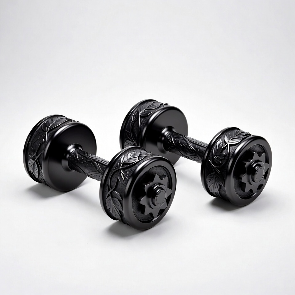 black dumbbells, carved dumbbells, exercise gear, fitness equipment, floral design, gym weights, hand weights, isolated background, leaf carving, ornate dumbbells, strength training, weightlifting, workout tools, dumbbells