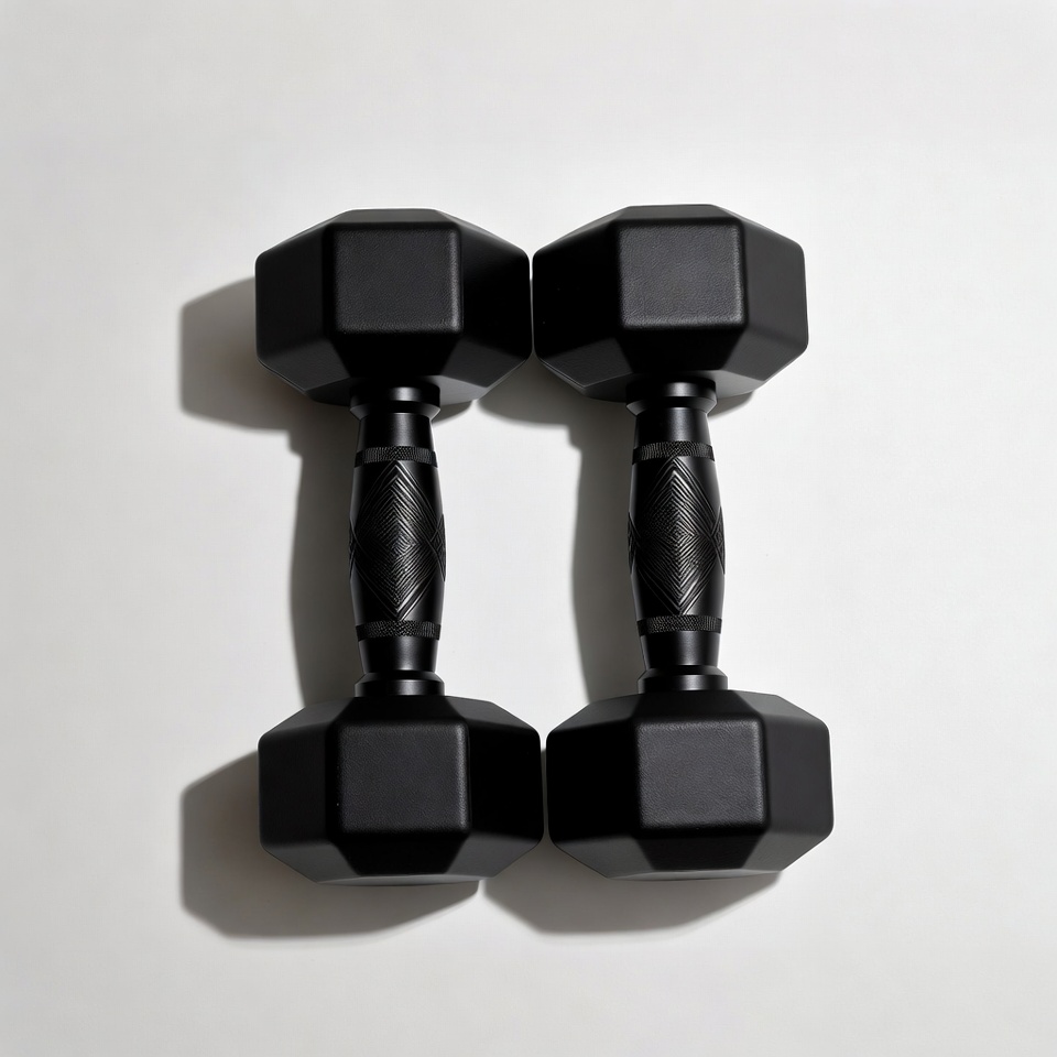 black dumbbells, black weights, exercise gear, fitness, fitness weights, gym equipment, hex dumbbells, hexagonal weights, home gym, isolated background, matte finish, pair dumbbells, rubber grip, strength training, weightlifting, weights, workout tools, dumbbells