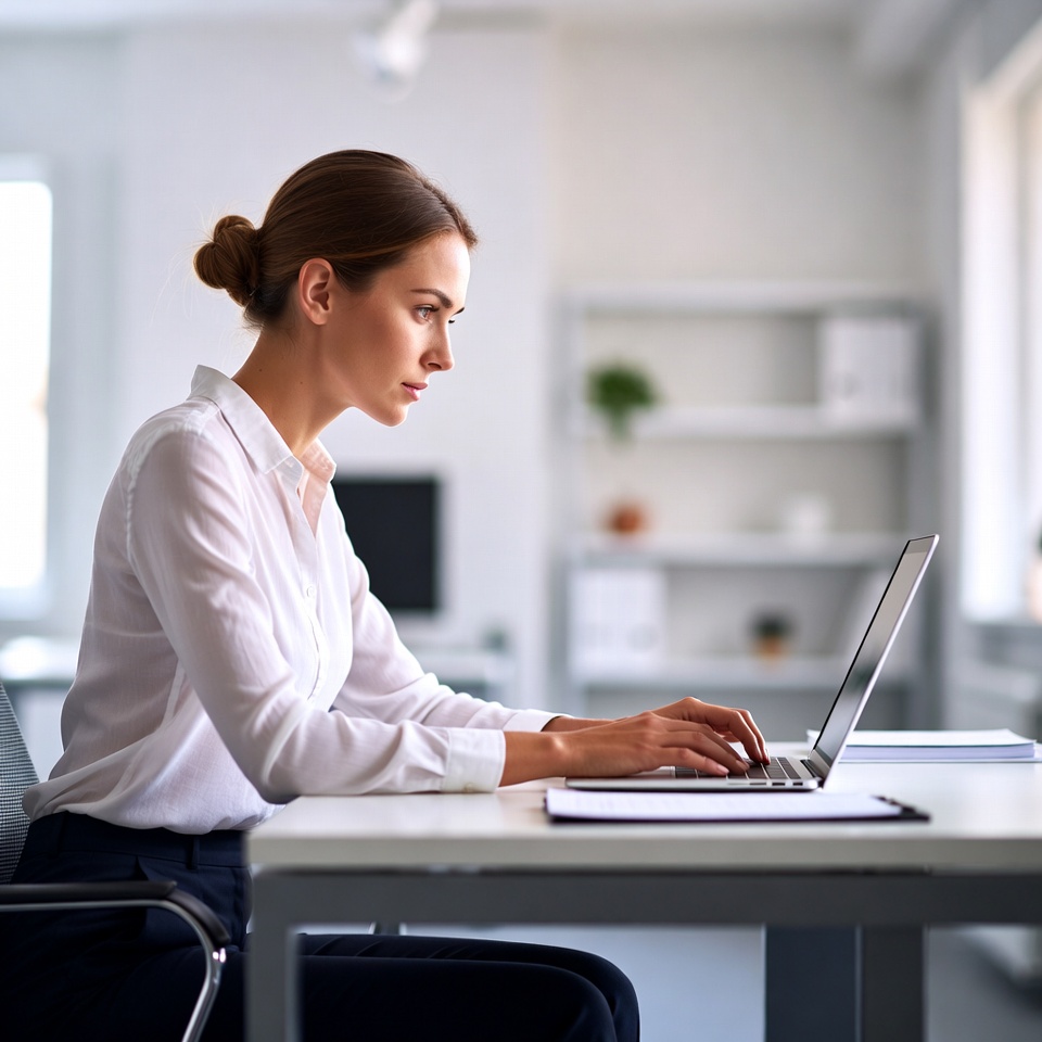 A woman with brown hair in a bun sits at a white desk in a modern office, typing on a silver laptop. She wears a white blouse and dark pants, viewed from the side with a focused expression. The background features large windows, shelves with plants, and office supplies.