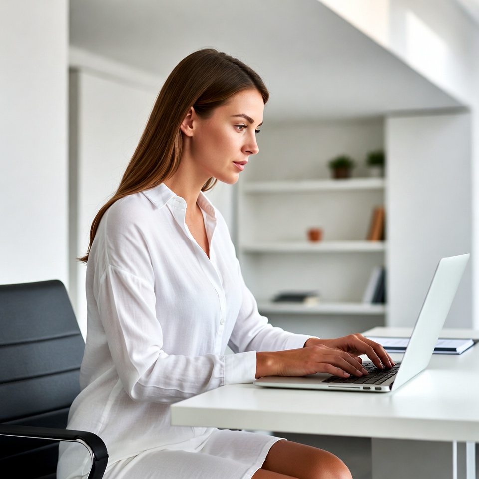 A woman with long brown hair sits at a white desk typing on a silver laptop. She wears a white button-up blouse and is positioned in a modern office with white cabinets, plants, and bookshelves in the background. A black office chair supports her as she focuses on her work.