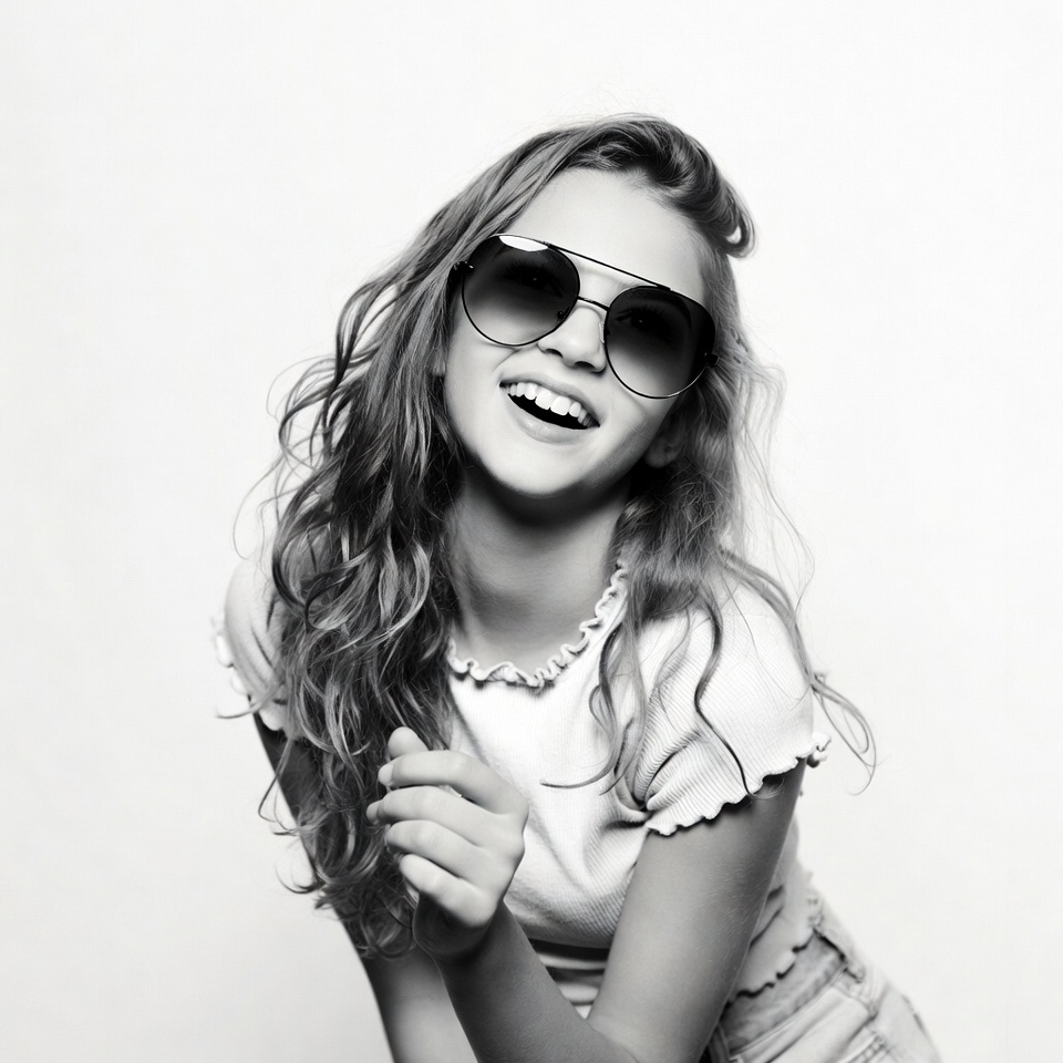 A young girl with long wavy hair smiles broadly while wearing oversized round sunglasses in a black and white portrait. She has a ruffled collar on her white top and poses with hands near her face against a plain white background. Her expression is joyful and engaging.