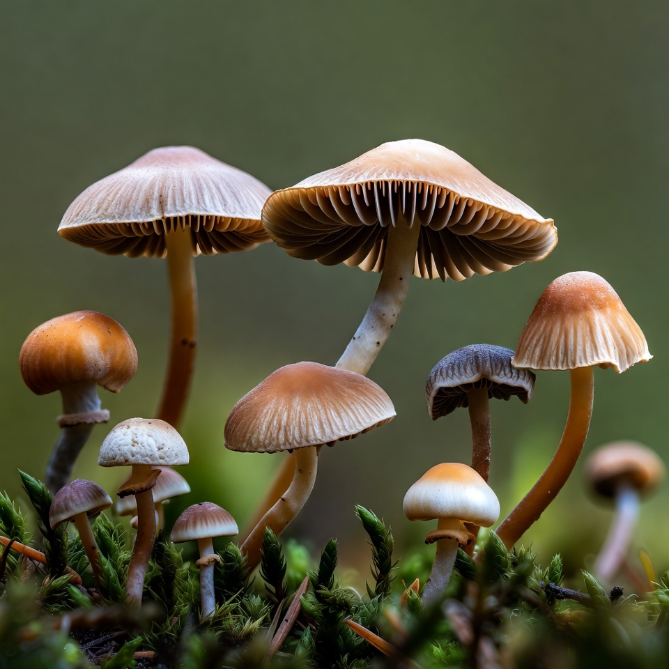 brown caps, cluster, forest floor, fungi, green moss, grooved caps, macro photography, moss, mushroom group, natural habitat, nature, slender stems, small fungi, tan mushrooms, white caps, wild mushrooms, woodland, mushrooms