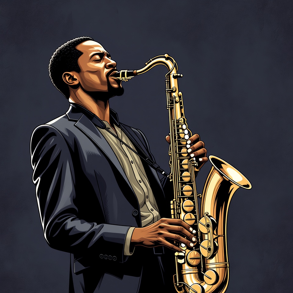An illustration of an African-American man with short curly hair and a goatee plays a golden saxophone. He wears a dark suit jacket and light shirt, standing against a dark background. His eyes are closed as he blows into the mouthpiece, fingers positioned on the keys.