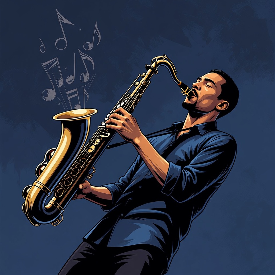 An illustration of an African-American man with a beard playing a golden saxophone on a dark blue background. He wears a blue shirt with rolled sleeves and black pants, leaning dynamically into the performance. Musical notes float around him, emphasizing the jazz theme.