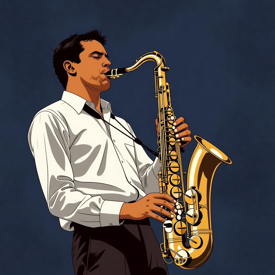 A stylized illustration depicts a man with short dark hair playing a large golden saxophone. He wears a white collared shirt and dark pants, standing against a solid blue background. His eyes are closed in concentration as he blows into the mouthpiece.