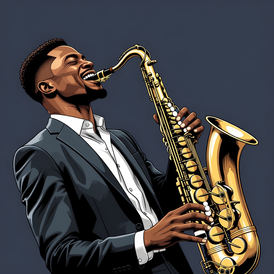 Black man, beard, dark background, golden saxophone, illustration, jazz musician, man, musical instrument, musician, performance, playing saxophone, saxophone, short hair, suit, vector art, white shirt, African-American man