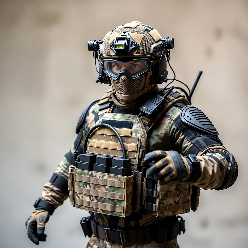 A male soldier stands in full tactical gear against a neutral background. He wears a tan and black multicam helmet with night vision goggles, protective mask, and armored vest loaded with pouches and magazines. His gloved hands are positioned at his sides, emphasizing the detailed military equipment.