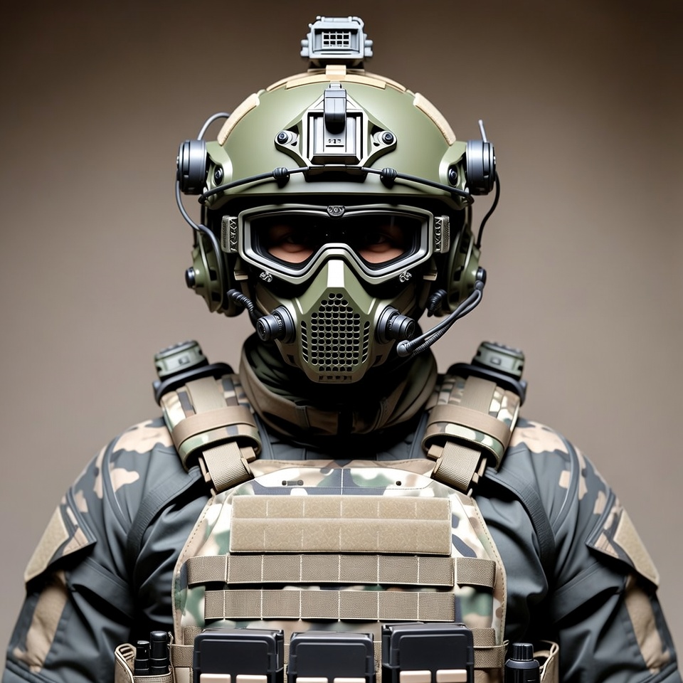 A soldier stands frontally wearing a green tactical helmet with night vision goggles and communication headset. He has a full-face mask with integrated goggles and a respirator, paired with multicam camouflage uniform and plate carrier vest. Various tactical pouches and straps are attached to his gear against a plain background.