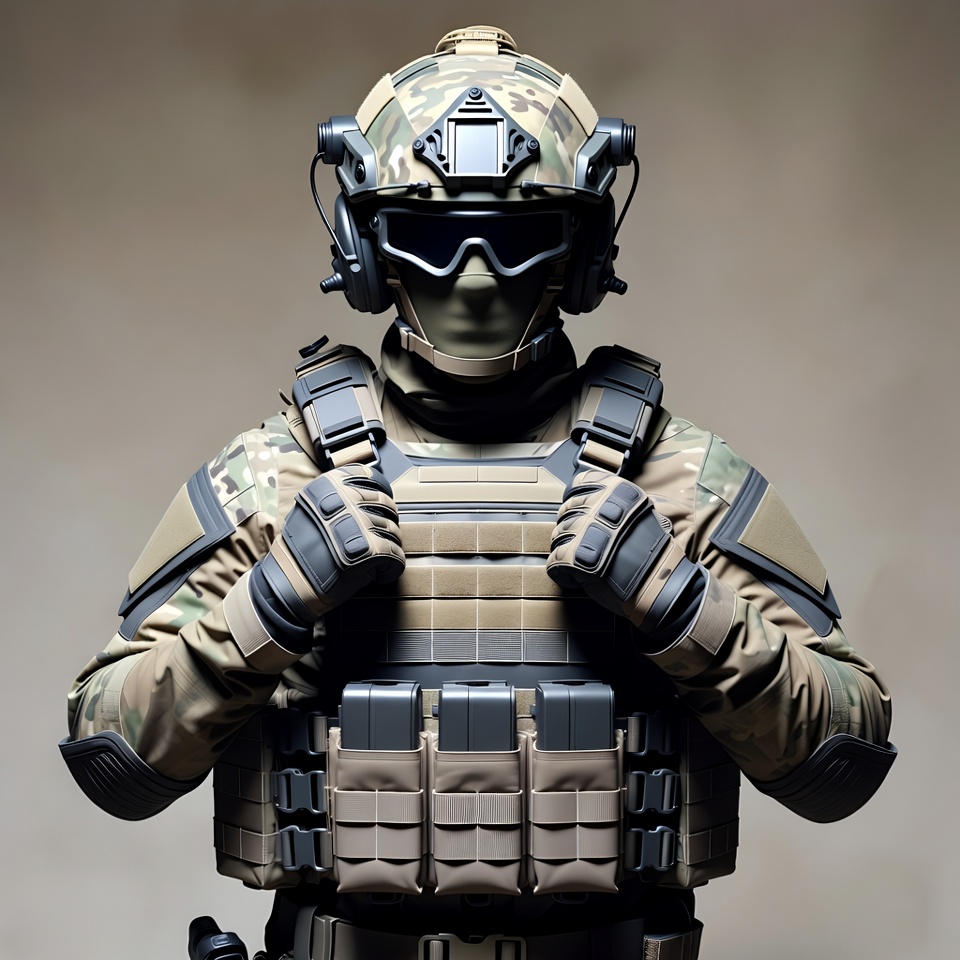 A soldier stands frontally wearing full tactical camouflage gear on a neutral background. He has a helmet with night vision goggles, tactical vest with magazine pouches, gloves, and a balaclava covering his face. His goggles are dark-tinted, and straps secure all equipment firmly.
