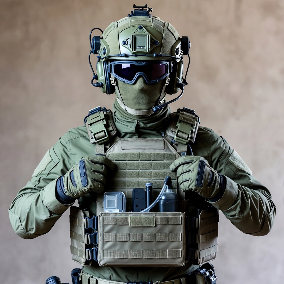 A soldier wearing a green tactical helmet with night vision goggles and communication headset stands against a beige background. He is dressed in green camouflage uniform, plate carrier vest loaded with pouches, magazines, and gear, and black gloves. His face is covered by a balaclava and goggles.