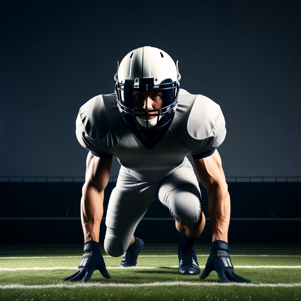 A muscular man in white football uniform and helmet crouches in a ready stance on a green turf field. He wears black gloves and cleats, with his hands positioned on the ground. The background features a dark stadium with blurred stands.