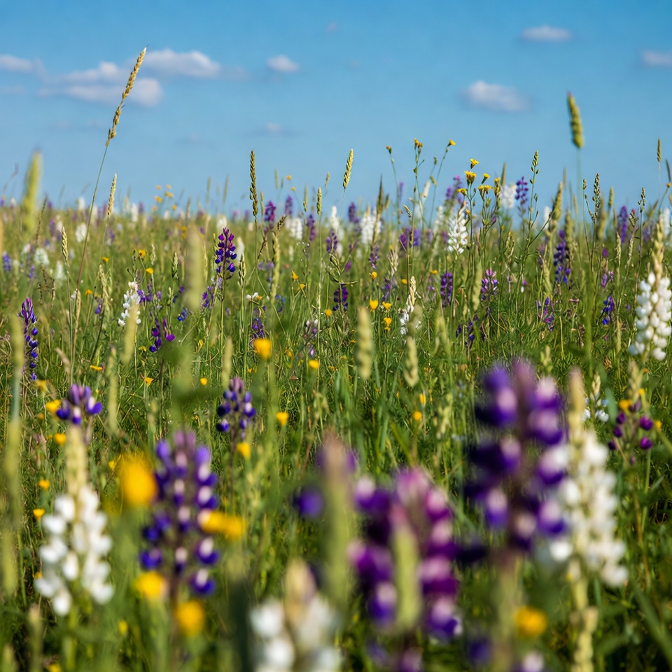 blooming, blue sky, clouds, field, flora, floral field, flower meadow, goat's rue, golden wheat, grass field, green grass, lupine flowers, meadow, natural landscape, nature, outdoor, purple lupines, sky background, summer, vibrant colors, wheat stalks, white flowers, wild bloom, yellow flowers, wildflowers