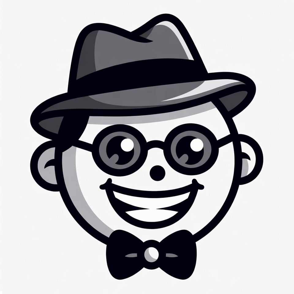A cheerful cartoon man with a round white face and black outlines wears a gray fedora hat, large round glasses, and a black bowtie. He has a big smiling mouth with white teeth and small ears. The illustration is simple line art on a transparent background.
