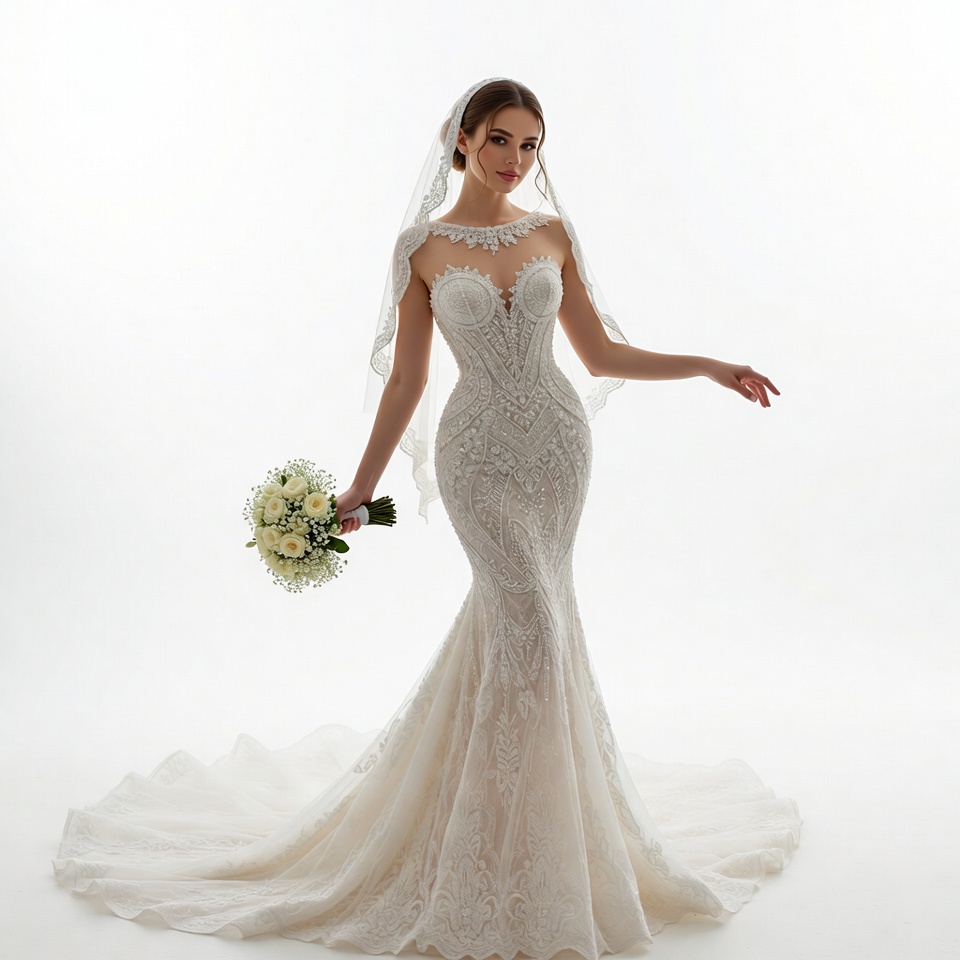 A woman with a sheer veil and brunette hair stands gracefully in a form-fitting white lace mermaid wedding gown on a white background. She holds a bouquet of white flowers in her right hand and extends her left arm elegantly. The intricate lace details accentuate the gown's corset bodice and flowing train.