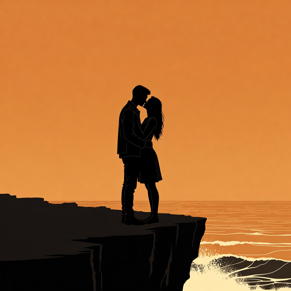 A black silhouette illustration depicts a man and woman kissing passionately on the edge of a rocky cliff. The man wears a jacket and pants while the woman has long hair and wears a dress. They stand against an orange sunset sky with ocean waves crashing below.