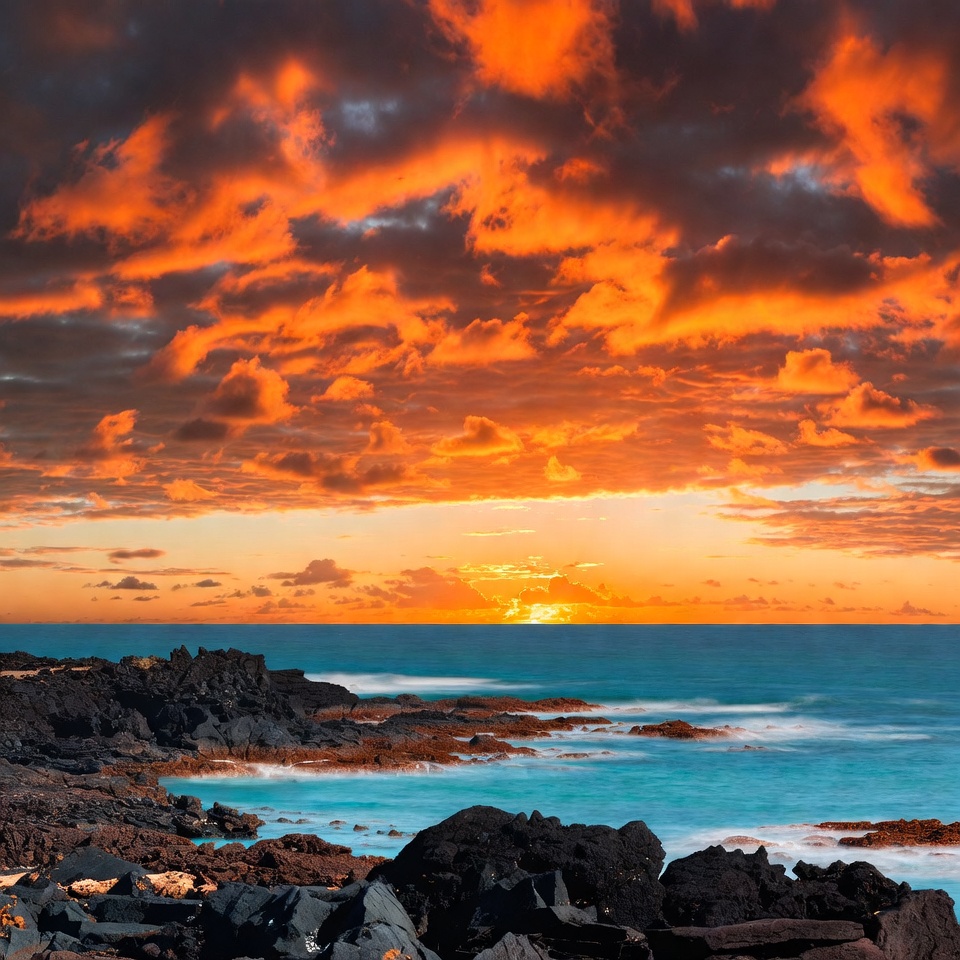 beach, clouds, coast, coastline, dramatic sky, horizon, landscape, lava rocks, nature, ocean, orange sky, purple clouds, red clouds, rocky shore, sea, seascape, sky, sunrise, turquoise water, volcanic rocks, waves, sunset