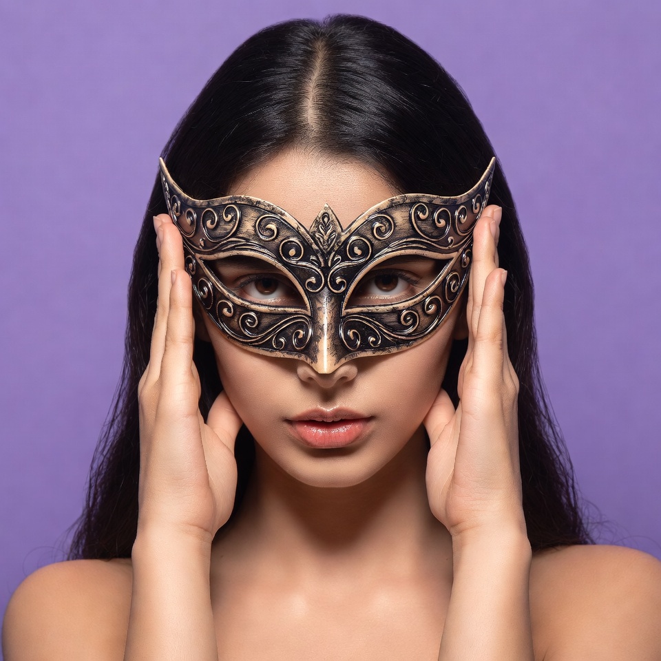 A young Asian woman with long straight black hair holds a gold ornate masquerade mask in front of her face. She has a subtle smile and wears a strapless top against a solid purple background. Her hands gently grip the intricate bronze mask with floral designs.